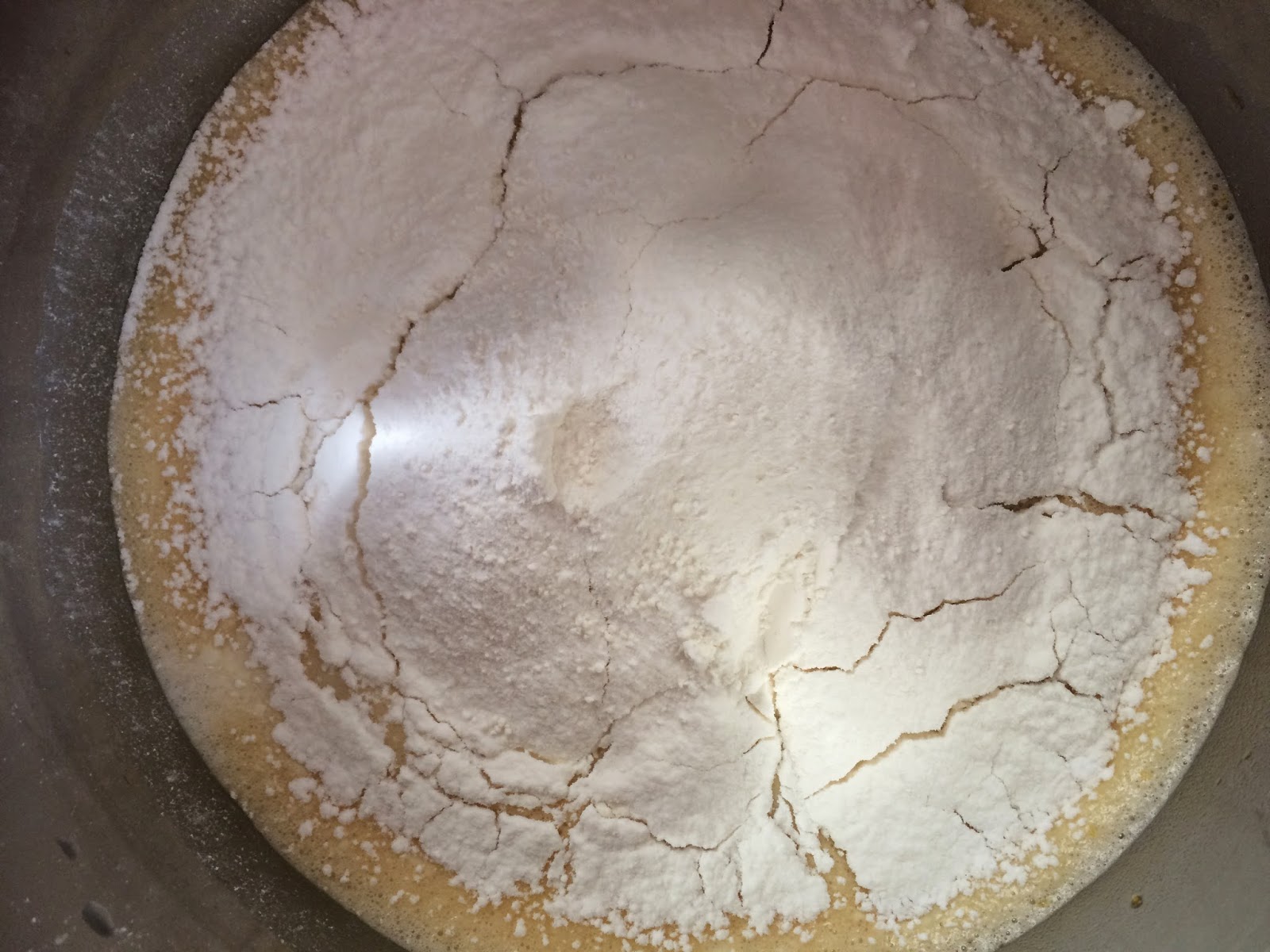 (2)麵粉、泡打粉篩勻後,放入拌勻的液體中,用橡皮刀慢慢由底部翻、壓、翻、壓的方式,將麵糊拌勻,並放置冷藏 1 個小時,讓它充分鬆弛。(天氣冷則不需冷藏)