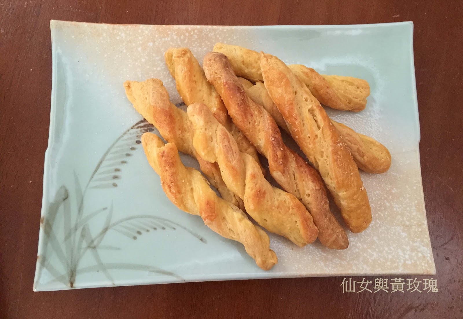 (6)再切成 1 公分寛的長條,搓扭成螺旋狀,刷上蛋汁,再撒上少許起士粉,排在鋪有烘焙紙的烤盤上,放入 200 度C的烤箱中,烤 10 分鐘,再改成 150 度C,烤 10 分鐘,即完成奶香麵包棒。