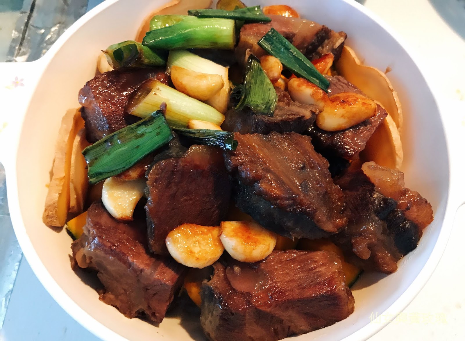 (2)牛肉(牛臉脥肉)買了 8 盒,應付4個星期的封鎖期,牛臉脥肉可燉、可煮、可鹵,肉中分佈豐富的凝膠狀筋絡,需要長時間小火慢煮。以牛臉脥肉製作這道「南瓜燉牛肉」,口感和風味特佳。
