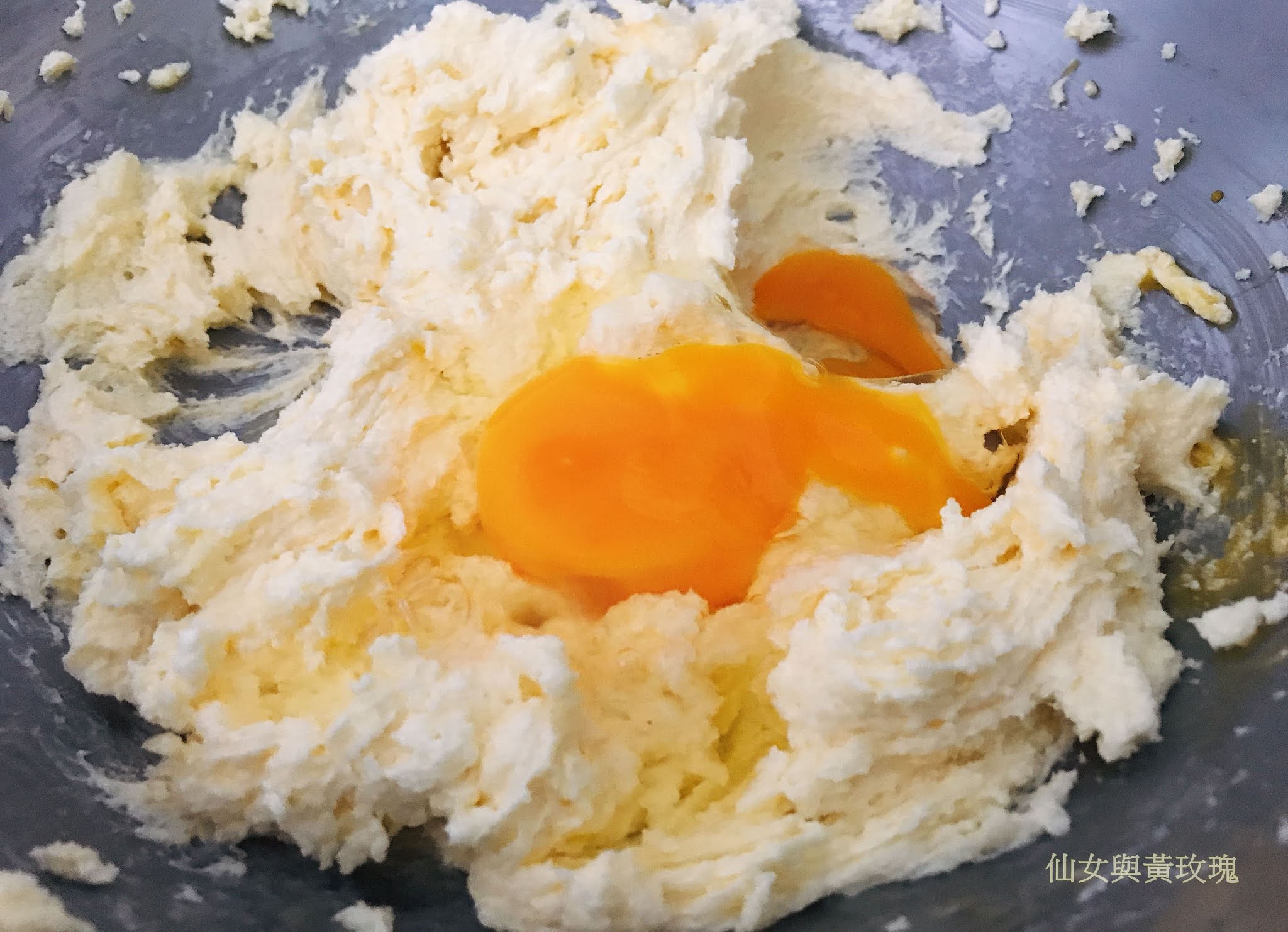 (2)蛋分次加入奶油糊中,以打蛋器充分打勻,成奶蛋糊。並打開烤箱預熱至 180 度C。