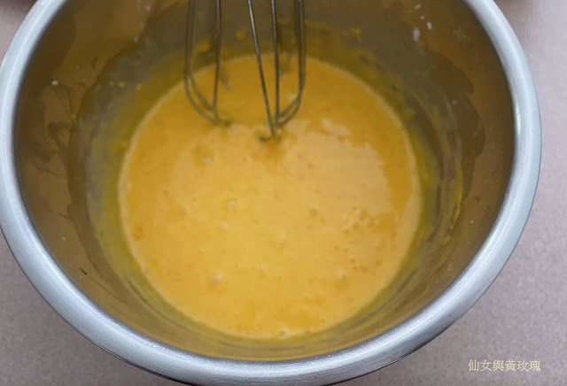 (4)將麵團放在較大的容器,趁麵團還溫熱,分次加入蛋黃(一次1個蛋黃與麵團充分混勻,才再加另1個蛋黃,最後加1個全蛋),拌成順滑的蛋黃糊(以電動打蛋器,較容易操作)。