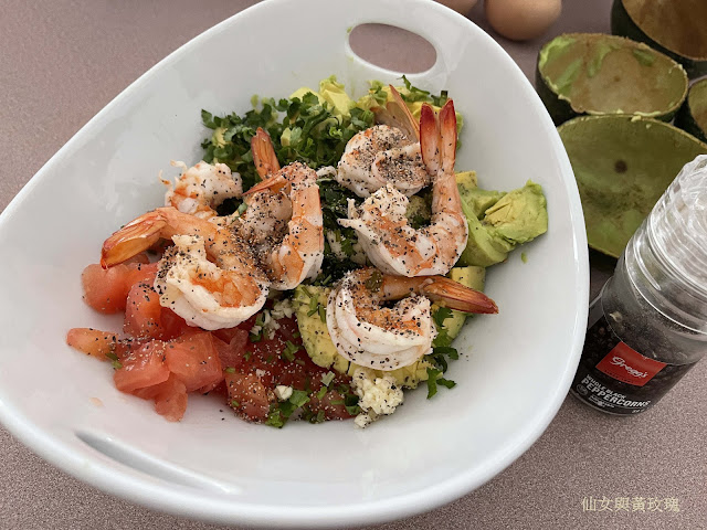 (2)蕃茄丁、酪梨丁、香菜末、蒜末、蝦仁、黑胡椒粉、檸檬汁,全部拌勻即可。