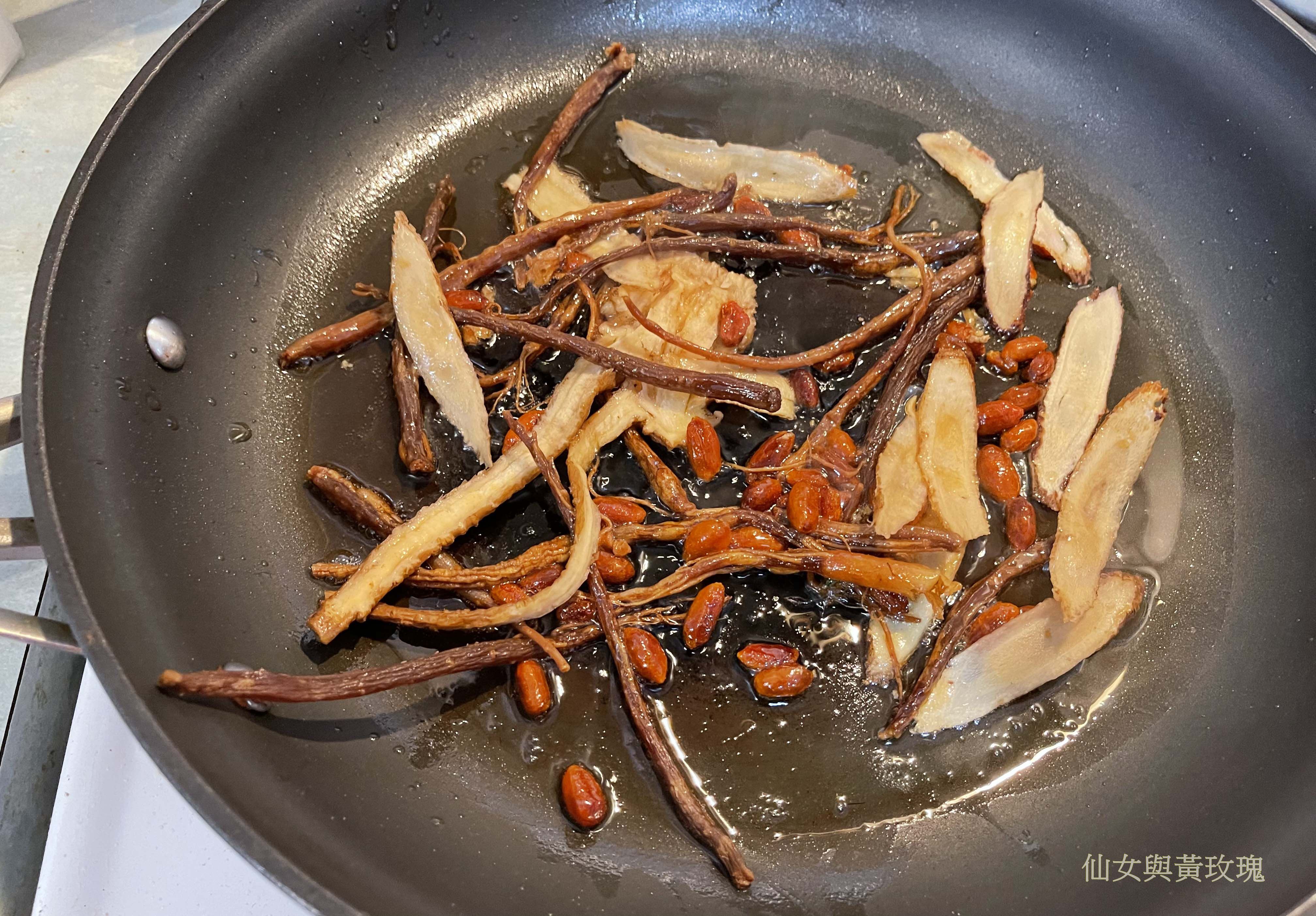 (3)炒鍋放入香油將濾出的藥材炒香,再放入雞塊,煎至兩面金黃。